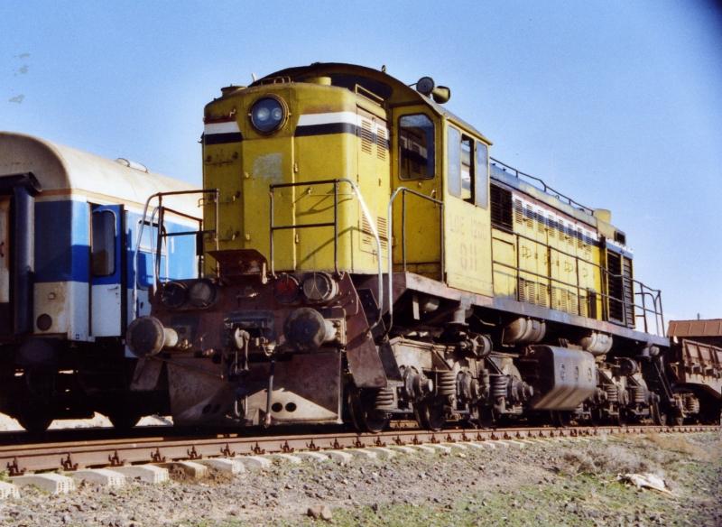 Die LDE1200-011 in Bahnhof Zalabiye mit einem Güterzug. Im Hintergrund ein Schlafwagen der CFS. Dieses seltene Bild wurde mit freundlicher Genehmigung von Richard a. Bowen bereitgestellt.
