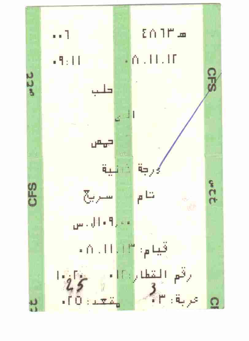 Fahrkarte No.4863 der CFS, Zug-Nummer 11, Ausgestellt am 12.November 2008 um 09:11, von Aleppo nach Homs, zweite Klasse, Kostet 109 syrische Lira, Abfahrt am 13.November.2008 um 10:20 Uhr. Waggon No.3 Sitz No.25